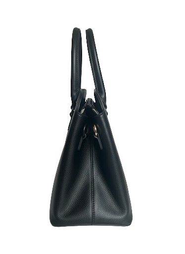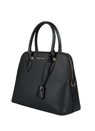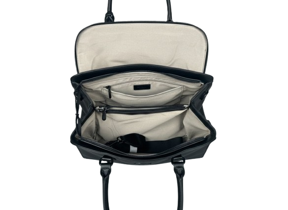تحتوي الحقيبة على مقبضين علويين مريحين للحمل باليد، مع تفاصيل معدنية بلون ذهبي تضيف لمسة أنيقة، بما في ذلك السحّاب والحلقات الجانبية التي تسمح بإضافة حزام كتف. التصميم بسيط وعملي، مع شعار صغير وناعم في الجهة الأمامية، ما يجعلها مناسبة للاستخدام اليومي وكذلك للمناسبات الرسمية.